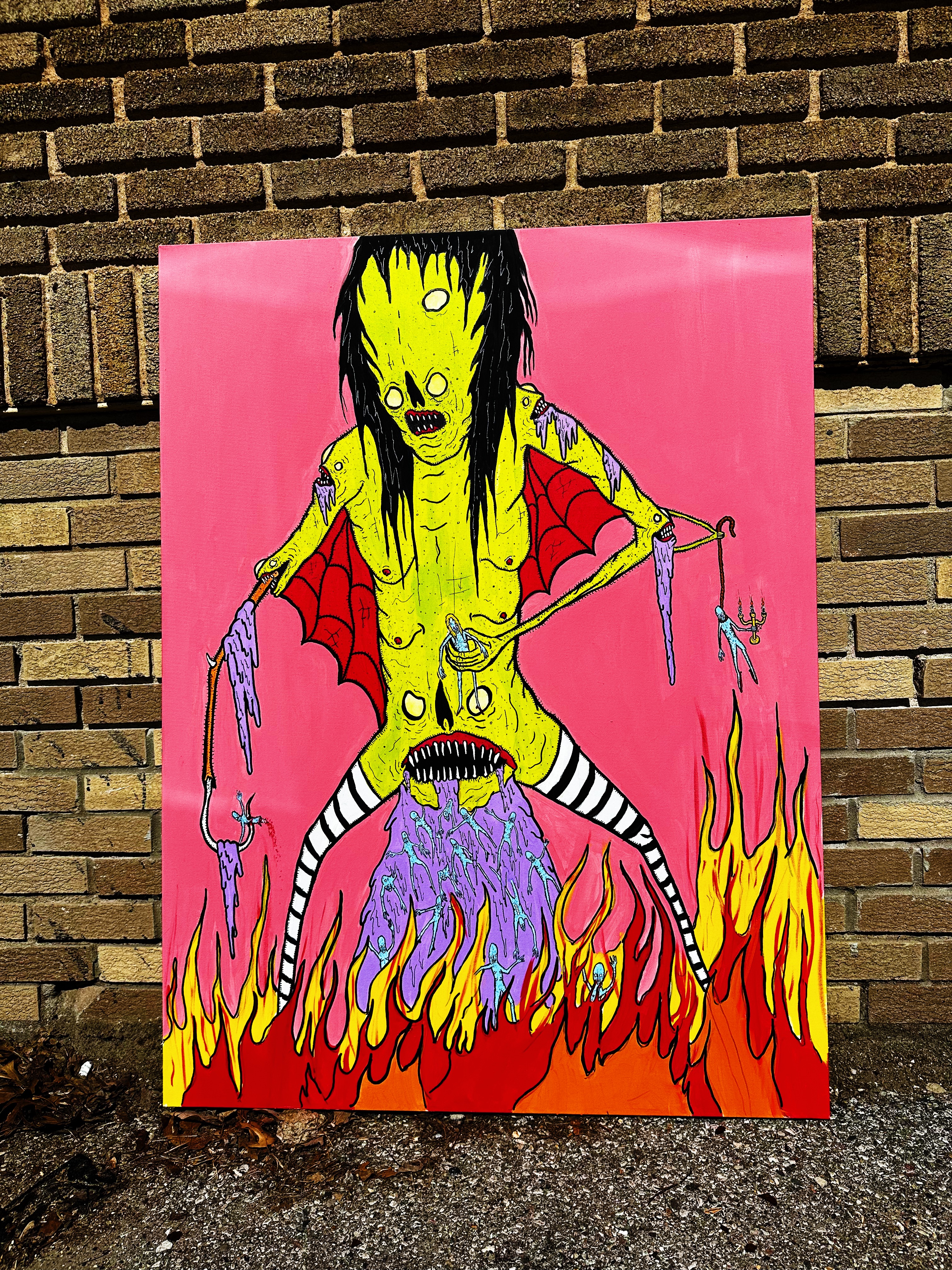 Find my work: I draw on clothes for my wife's store, Rock Paper Scissors Consignment Boutique, I'm a featured artist at both Broad Leaf Brewing locations, and I'm on Instagram @chapel0fghouls.